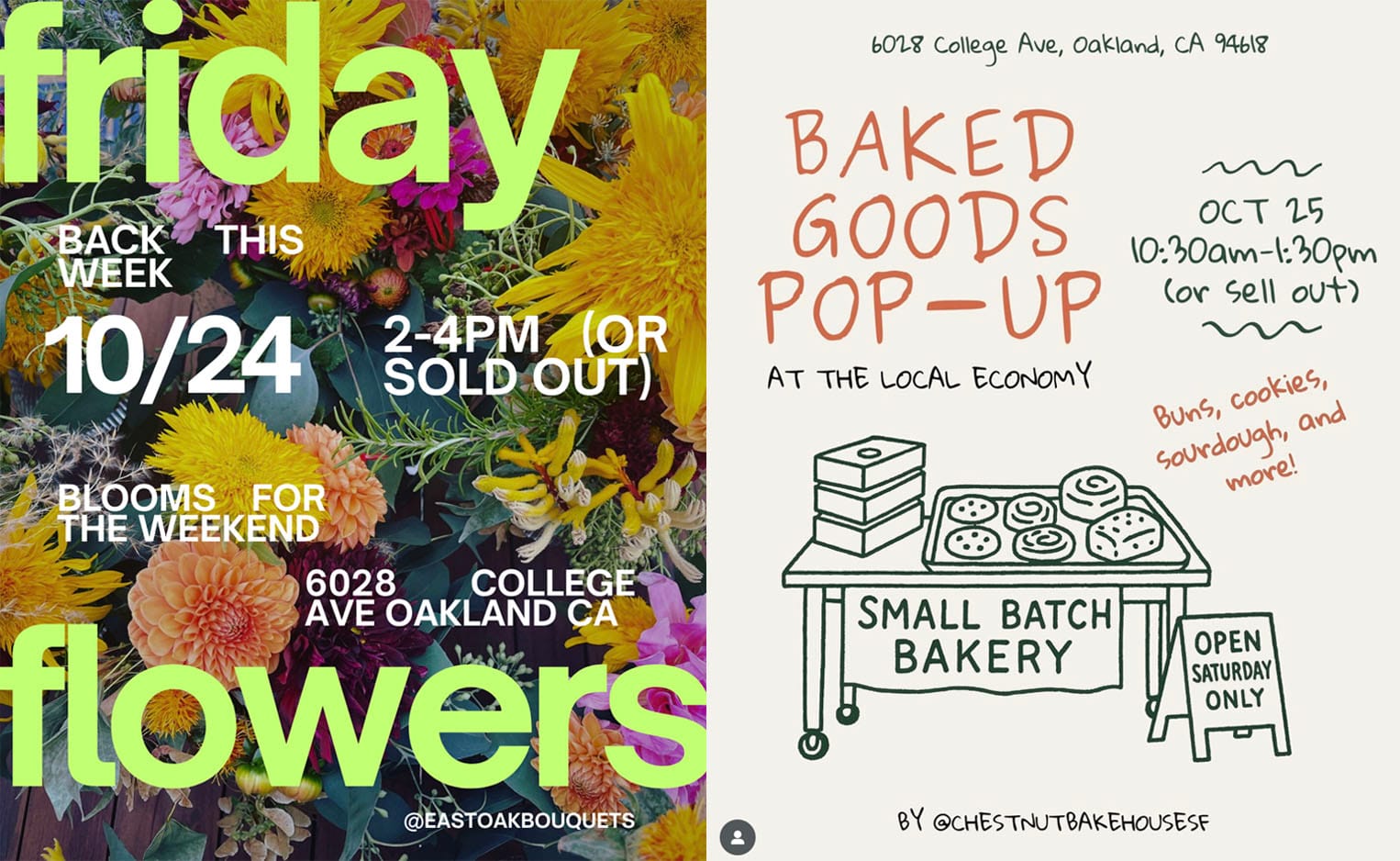 Before we get into it, we've got two things open to all that you should know about. On Friday afternoon, we've got Romi Hall of East Oak Bouquets popping up, selling flowers! 2-4pm (or sell out). On Saturday, Chestnut Bakehouse is popping up with some delicious stuff. That's gonna be from 10:30am to 1:30pm (or sell out). This is their very first pop-up. Get in on the new-new thing now.